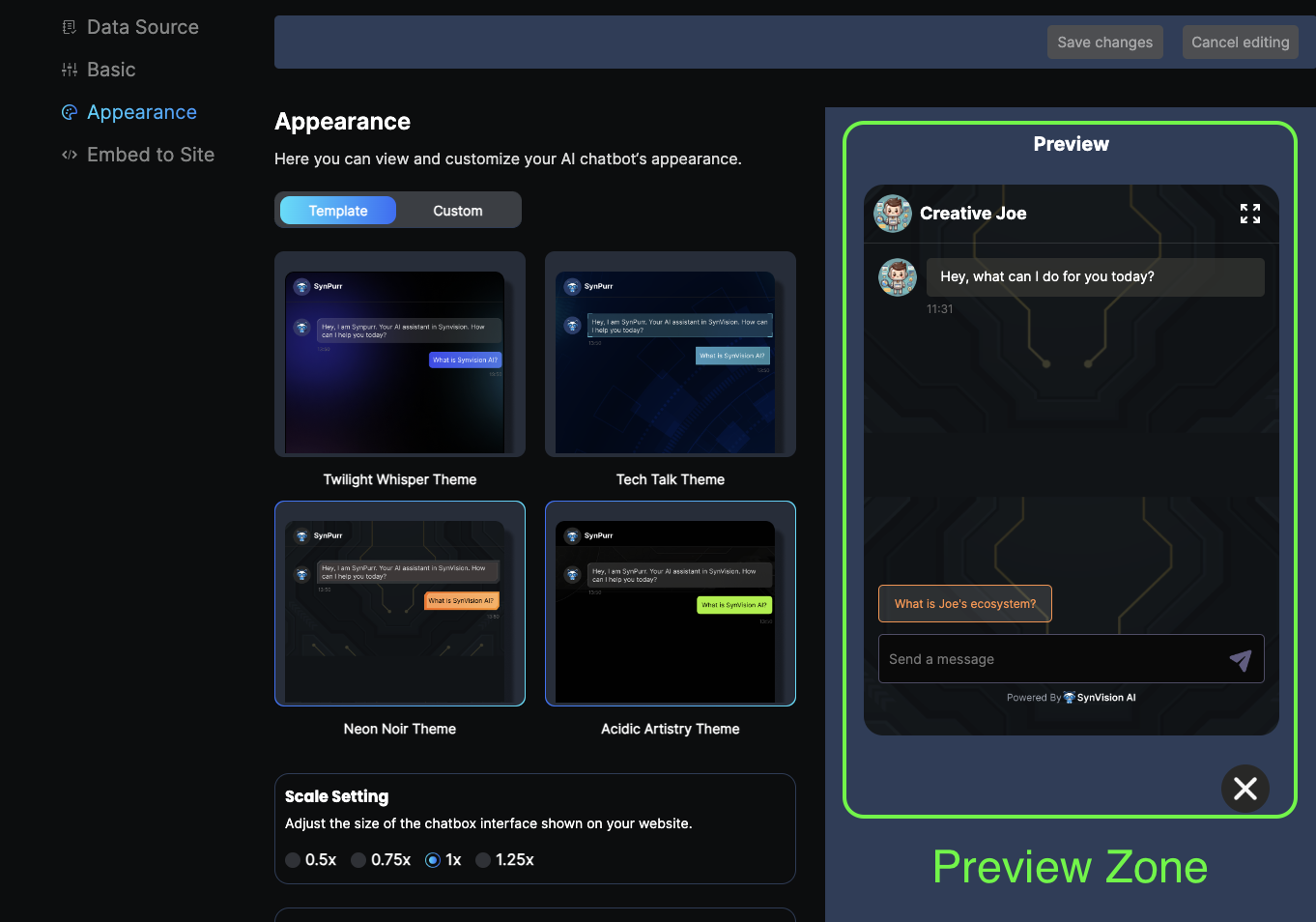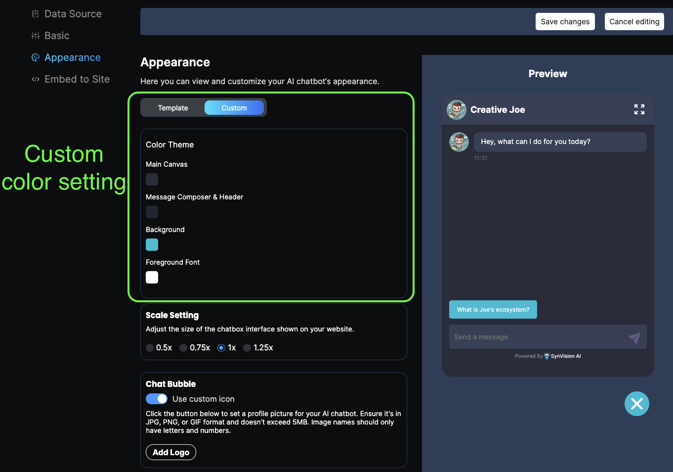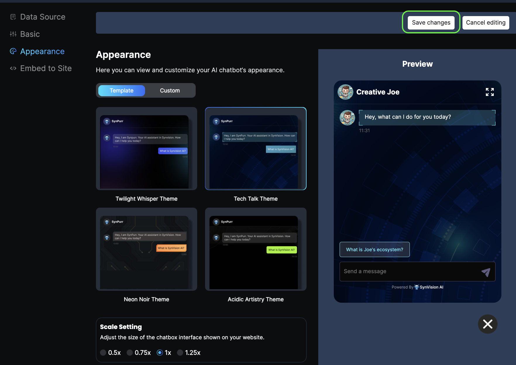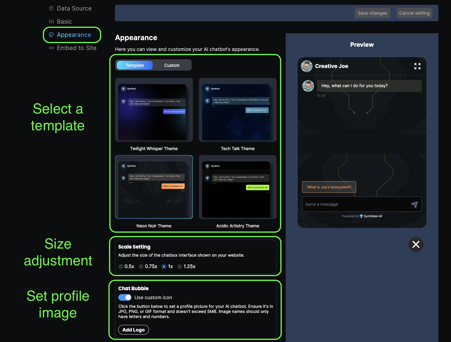 Next, continue with configuring the appearance of your chatbot on this page. You have the options to select a preset template, or customize all the colors of the chat interface, choose the size of the chatbox (the size refers to the actual dimensions of the chatbox when embedded on a third-party website), and select your preferred profile image for your chatbot.